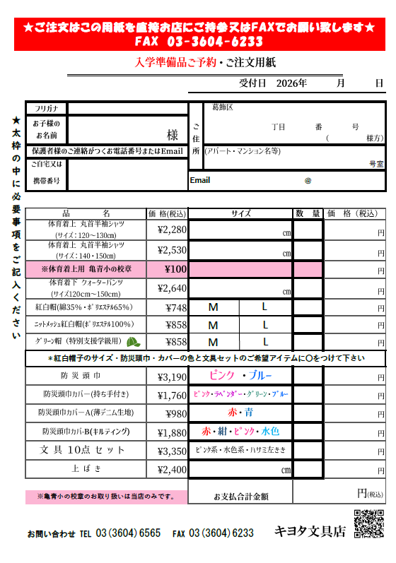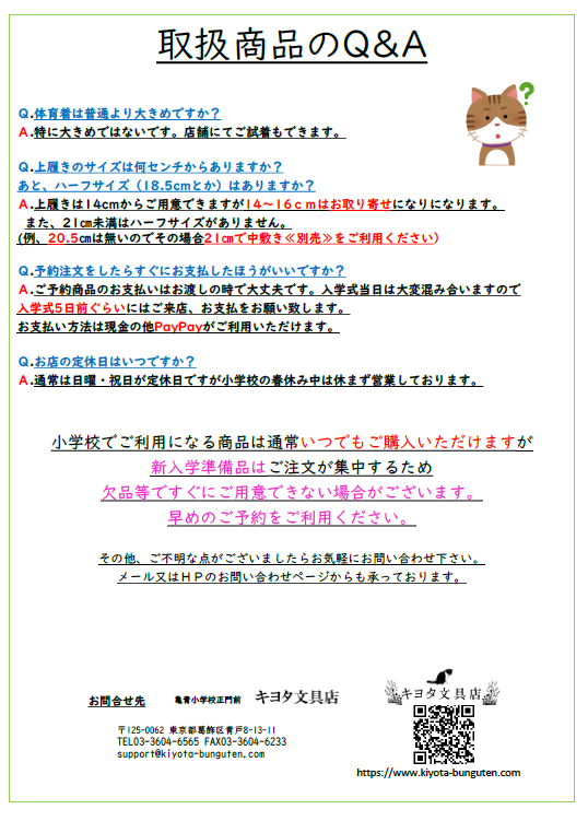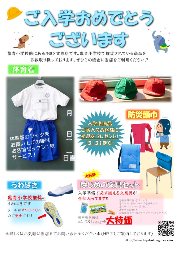 令和8年度🌸亀青小学校入学準備品のご案内🌸 入学準備品のご案内です。 体育着や上ばき、防災頭巾カバーなど 亀青小学校で推奨されているタイプの商品を取り揃えております。 もちろん他校の皆様もご利用いただけます‼ *亀青小学校ご入学準備のご案内* *よくあるお問い合わせ* *ご予約・お申込用紙*